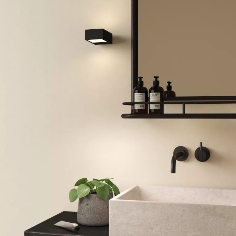 To create ambiance in the bathroom, you can use wall uplights or lights around the sink and bathtub to add depth and dimension to the room and highlight the texture or surface of the wall.