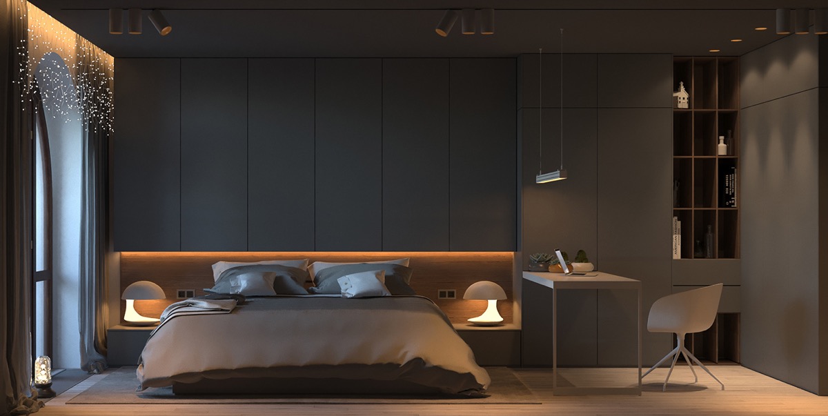 Because the bedroom is a room for relaxation to fill the body with energy for the new day, the design of interior lighting, therefore, needs to take comfort into account. Recessed downlights will help spread the light evenly throughout the area for a large bedroom, but you should avoid installing downlights above the pillow because they will dazzle your eyes.